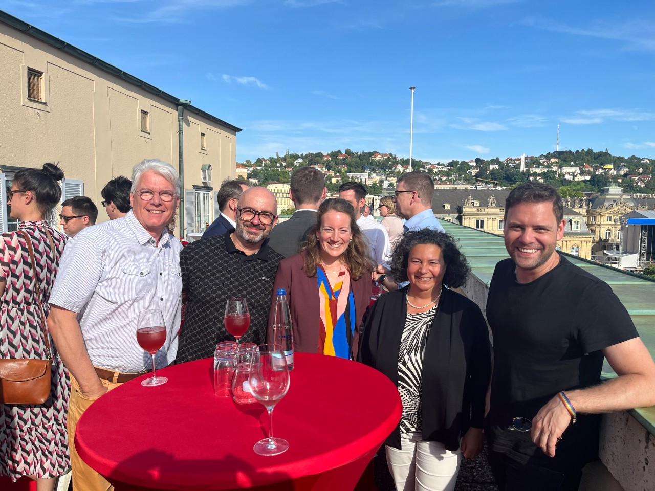 Andreas Stoch, Vorsitzender der SPD-Landtagsfraktion hatte zum Gespräch und Austausch mit den SPD-Landtagsabgeordneten im Rahmen einer "Rooftop-Party", dem Sommerfest der SPD, eingeladen. Unser Foto zeigt Siegfried Euerle, Vorsitzender des vdek-Landesaussschusses und Landeschef der DAK-Gesundheit, MdL Florian Wahl (SPD), Vorsitzender des Ausschusses für Soziales, Gesundheit und Integration sowie gesundheitspolitischer Sprecher der der SPD-Landtagsfraktion, Daniel Caroppo, Landespressechef der DAK-Gesundheit und Frank Winkler, Leiter Politik und Kommunikation der vdek-Landesvertretung Baden-Württemberg (von rechts nach links).
