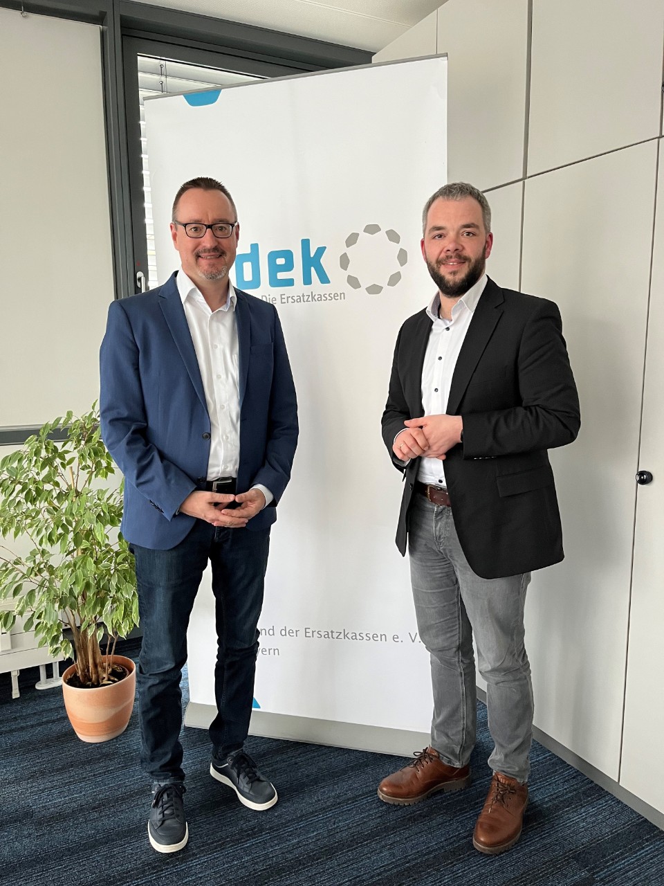 Bernhard Seidenath MdL (CSU), Vorsitzender des Ausschusses für Gesundheit, Pflege und Prävention im Bayerischen Landtag, und Thomas Hackenberg, Leiter der vdek-Landesvertretung Bayern