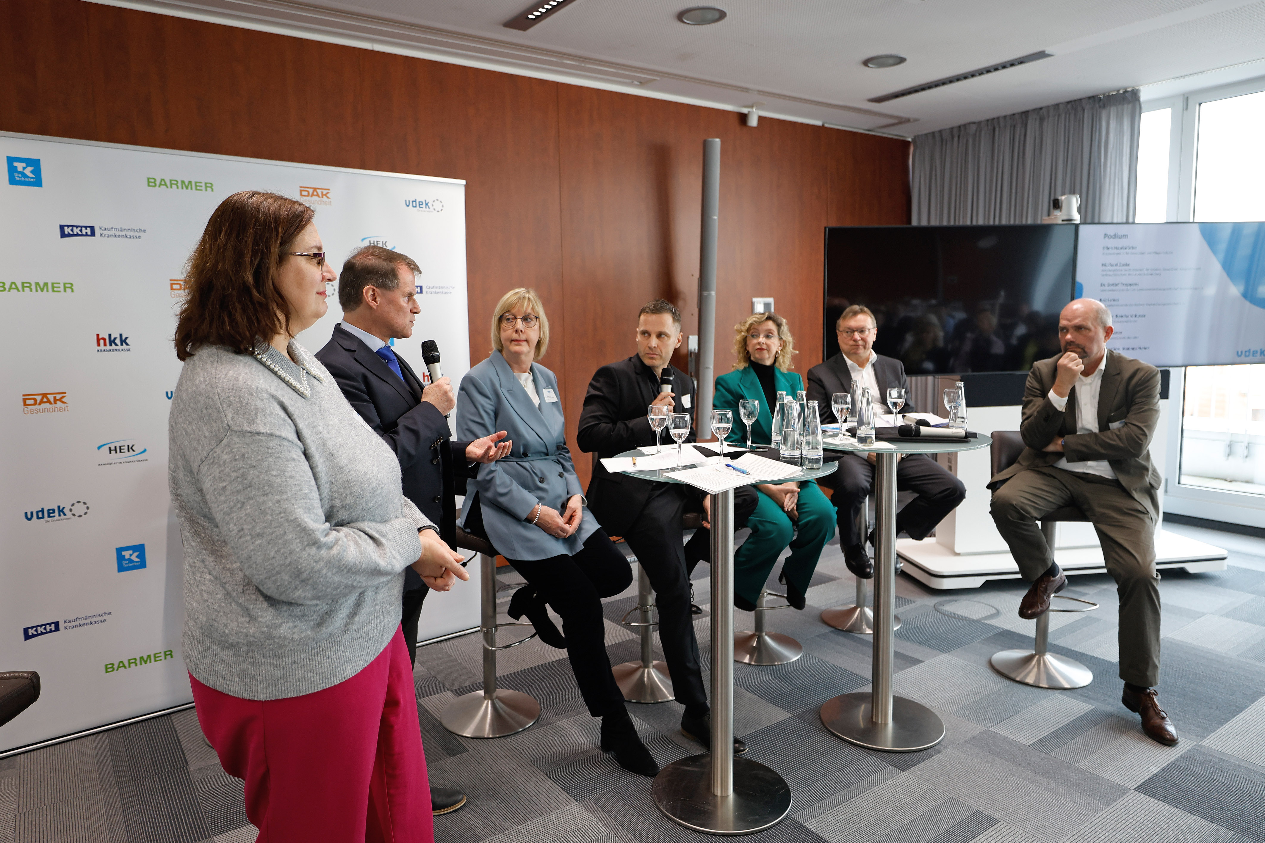 Mit einem neuen Veranstaltungsformat, dem vdek-NetzwerkTalk, brachte die Landesvertretung Berlin/Brandenburg am 30. Januar 2024 führende Expertinnen und Experten aus dem Gesundheitswesen zusammen, um über die anstehenden Veränderungen im Gesundheitswesen zu diskutieren. Zu den hochkarätigen Gästen zählten neben Prof. Reinhard Busse, Mitglied der Regierungskommission Krankenhaus, Ellen Haußdörfer, Staatssekretärin für Gesundheit und Pflege in Berlin, Michael Zaske, Abteilungsleiter im Ministerium für Soziales, Gesundheit, Integration und Verbraucherschutz des Landes Brandenburg, die Vorstandsvorsitzenden der Berliner und der Brandenburger Landeskrankenhausgesellschaft Brit Ismer und Dr. Detlef Troppens sowie die vdek-Vorstandsvorsitzende Ulrike Elsner.