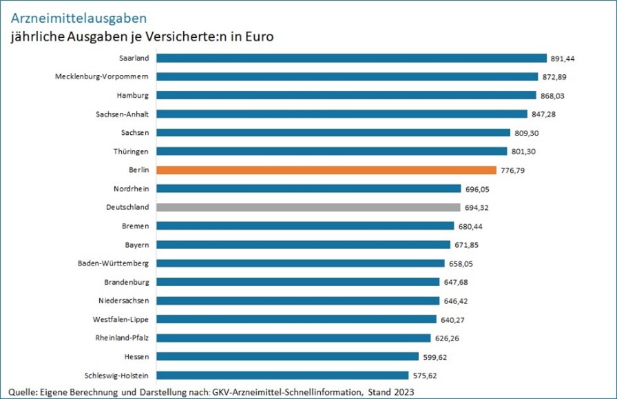 Im Vergleich mit anderen Bundesländern liegen die Arzneimittelausgaben der GKV in Berlin damit im oberen Drittel. Pro Versicherten fallen hier spürbar höhere Kosten an als im Bundesdurchschnitt.