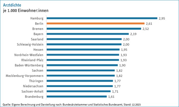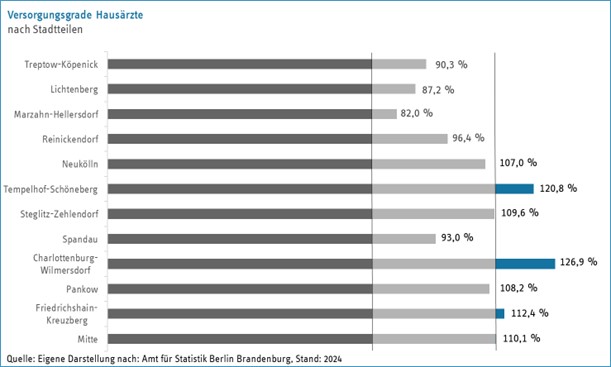 Berlin verfügt über eine im bundesweiten Vergleich hohe Dichte an niedergelassenen Ärzt:innen und Psychotherapeut:innen. Gleichwohl bestehen innerhalb der Stadt erhebliche regionale Unterschiede – insbesondere zwischen den zentralen Bezirken und den Außenbezirken.