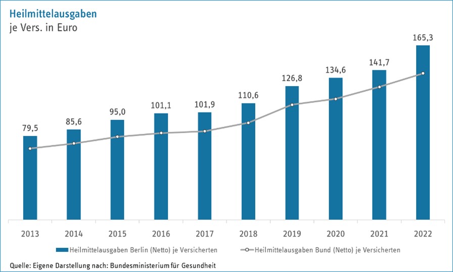 Seit 2013 sind die Heilmittelausgaben in Berlin deutlich gestiegen – von rund 80 Euro auf 165,3 Euro pro Versicherten im Jahr 2022. Damit liegt Berlin inzwischen klar über dem Bundesdurchschnitt.