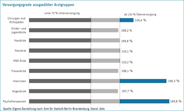 Ein Blick auf die Versorgungsgrade einzelner Fachgruppen zeigt deutliche Unterschiede: Während Internist:innen (166,3 %), Psychotherapeut:innen (169,8 %) und Chirurg:innen/Orthopäd:innen (126,4 %) deutlich überversorgt sind, liegt die Quote bei Hausärzt:innen (100,1 %) und Kinder- und Jugendärzt:innen (108,2 %) nur knapp über dem rechnerischen Soll.