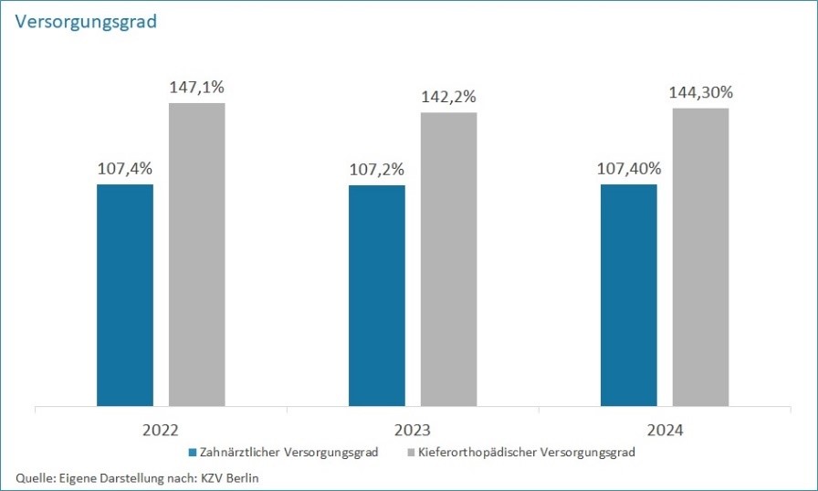 Der zahnärztliche und kieferorthopädische Versorgungsgrad in Berlin ist sehr hoch. Der zahnärztliche Versorgungsgrad liegt nahezu konstant bei 107 Prozent, der kieferorthopädische sogar bei über 140 Prozent.