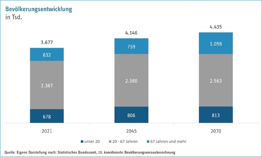 Diese Entwicklung verdeutlicht, dass die Hauptstadt gleichzeitig von einem Bevölkerungswachstum und von einer demografischen Alterung geprägt ist. Während die Zahl jüngerer Menschen weitgehend stabil bleibt, wird die Gruppe der Älteren künftig einen größeren Anteil an der Stadtgesellschaft ausmachen. Dies verändert langfristig die sozialen Strukturen, die Lebenswelten und auch die Nachfrage nach gesundheitsbezogenen Angeboten.