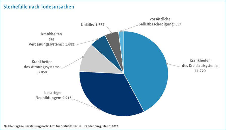 Die Grafik zeigt: Herz-Kreislauf- und Krebserkrankungen sind nach wie vor die häufigsten Todesursachen in Berlin – zusammen machen sie über 60 % aller Todesfälle aus.