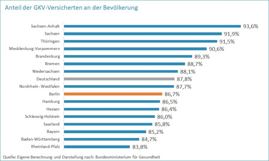 Mit einem Versichertenanteil von 86,7 % stellt die gesetzliche Krankenversicherung das zentrale Versorgungssystem in Berlin dar. Diese breite Absicherung durch die GKV bildet die Grundlage für ein solidarisch finanziertes Gesundheitswesen, das unabhängig von Einkommen, Herkunft oder sozialem Status allen Menschen offensteht.