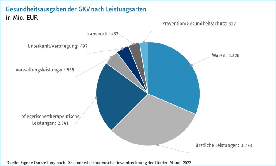 Die GKV wendet in Berlin pro Quartal rund 3,8 Milliarden Euro alleine für ärztliche Leistungen auf. Arzneimittel, Heilmittel sowie Ausgaben für pflegerische und therapeutische Leistungen bilden dabei die größten Einzelposten.