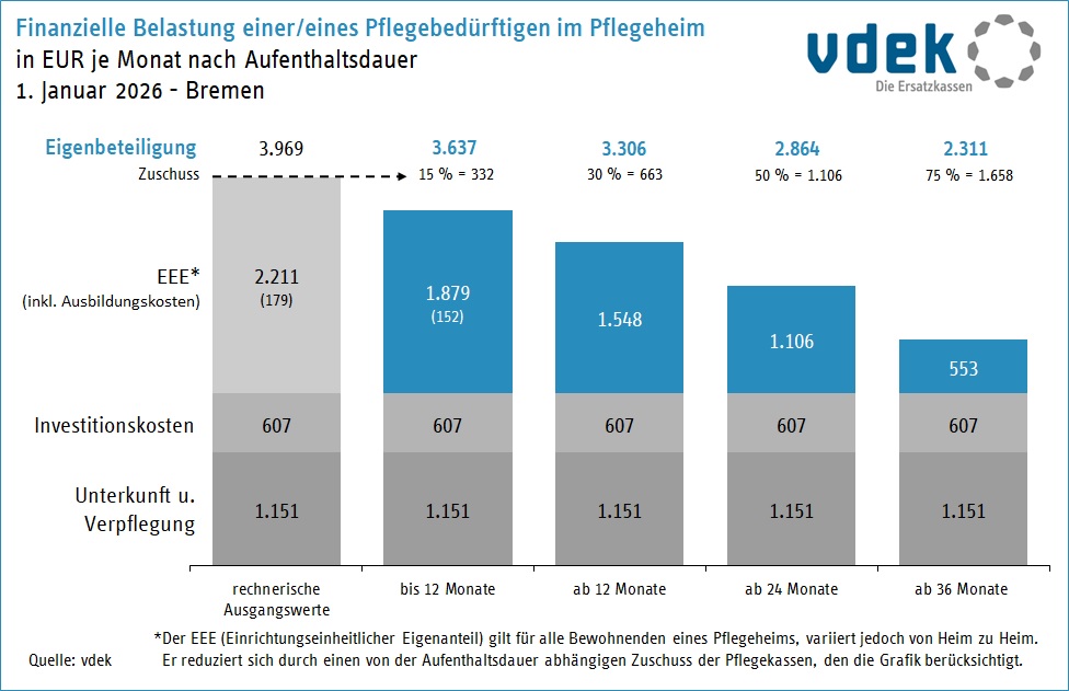 Finanzielle Belastung von Pflegebedürftigen in Bremer Pflegeheimen, gestaffelt nach Aufenthaltsdauer (Stand: Januar 2026)