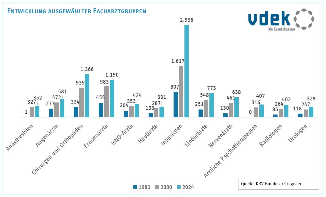 Der Zuwachs bei den einzelnen Fachrichtungen ist erheblich: So gibt es heute mehr als vier Mal so viele Chirurgen und Orthopäden, Nervenärzte und Radiologen wie 1980. Die Anzahl der Kinderärzte und Urologen hat sich in diesem Zeitraum (fast) verdreifacht. Frauenärzte, HNO-Ärzte und Hautärzte gibt es mehr als doppelt so viele.