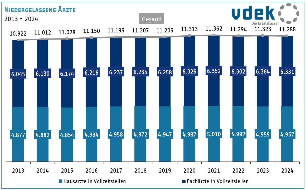 Das nachfolgende Schaubild weist die Zahl der Ärzte seit 2013 nicht mehr nach Personen, sondern nach Vollzeitstellen aus. Damit wird eine entsprechende Umstellung der Vertragsarztstatistiken der Kassenärztlichen Bundesvereinigung nachvollzogen. Das numerische Absinken von 2012 auf 2013 ist diesem statistischen Effekt geschuldet und bedeutet keine Verschlechterung des Versorgungsangebots.