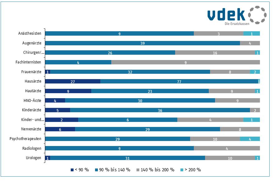 Fast 90 Prozent der fachärztlichen Planungsbereiche haben diese Schwelle überschritten und sind wegen Überversorgung gesperrt. Von den hausärztlichen Planungsbereichen ist demgegenüber nur gut ein Fünftel gesperrt.