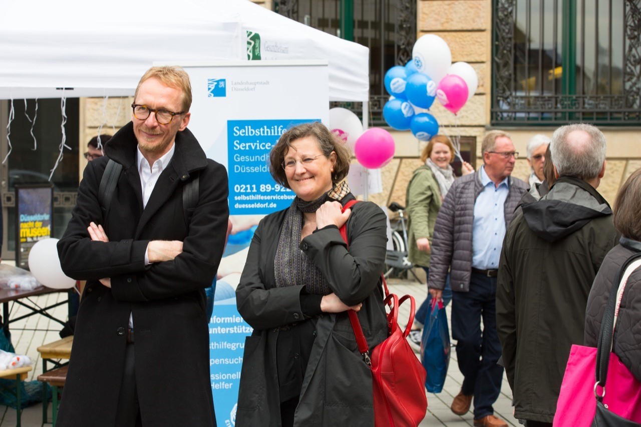 Moderatorin Benninghoven mit einem männl. Interviewpartner - 13.4.18 Start der NRW Selbsthilfe-Tour Düsseldorf