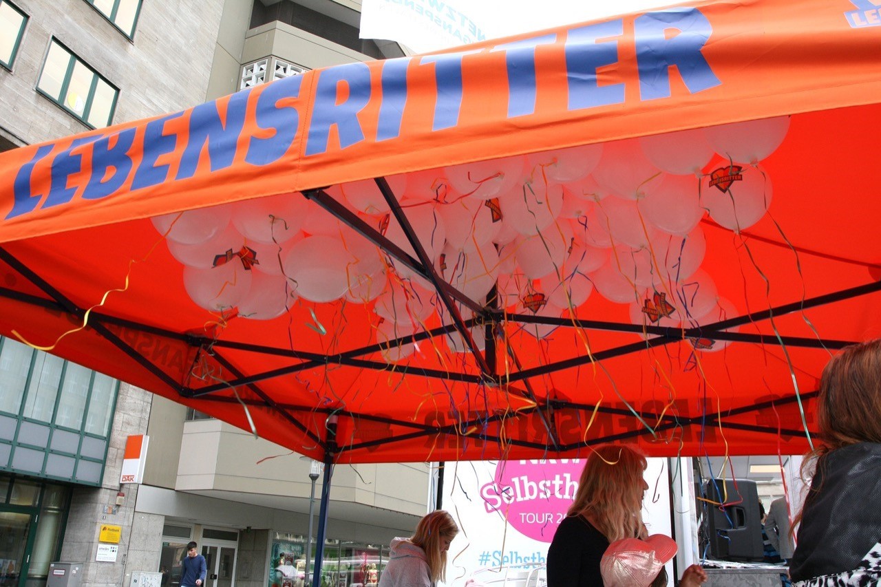 Viele Luftballons unter dem Dach des Info-Standes, Tag der Organspende, 2.6.18, Essen, NRW Selbsthilfe-Tour