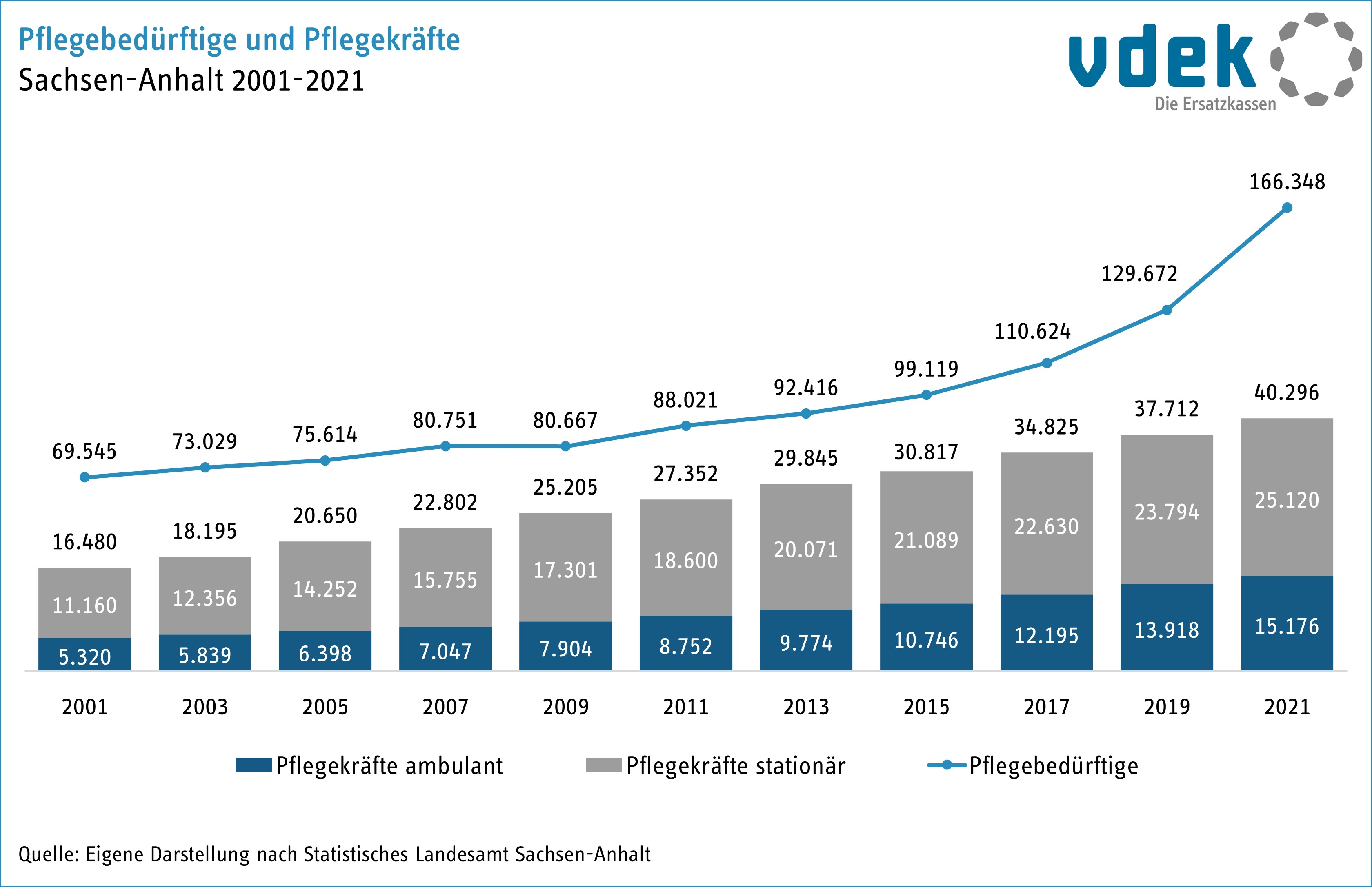 Aufgrund des demografischen Wandel hat sich die Zahl der Pflegebedürftigen in Sachsen-Anhalt innerhalb von zehn Jahren nahezu verdreifacht. Die Zahl der Pflegekräfte steigt bei weitem nicht so rasant. Im Jahr 2023 kümmerten sich 40.436 Pflegekräfte gemeinsam mit Angehörigen um 204.236 Pflegebedürftige.