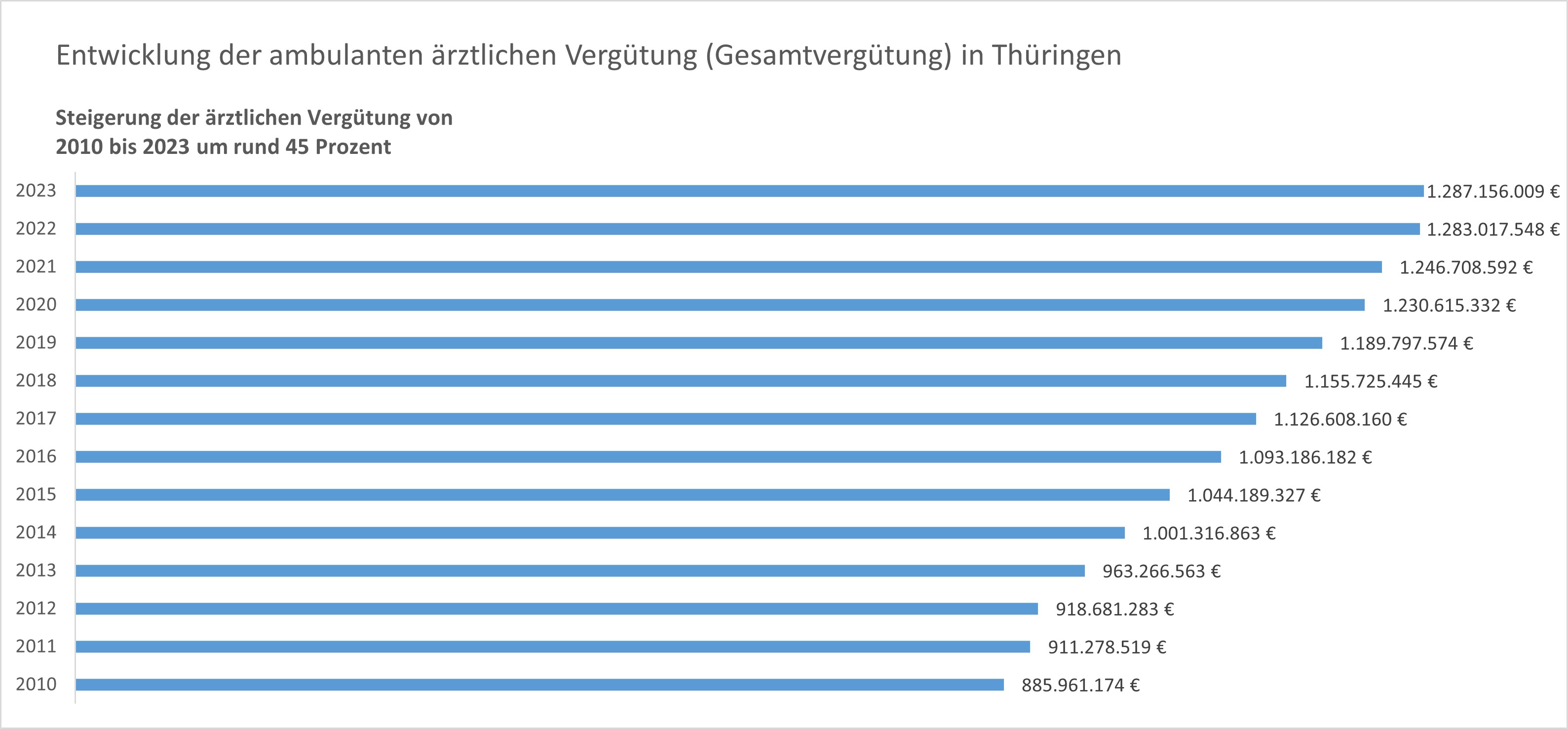In der Zeit von 2010 bis 2023 ist die von den gesetzlichen Krankenkassen an die niedergelassenen Thüringer Vertragsärzte gezahlte Gesamtvergütung von 886 Millionen Euro auf rund 1,29 Milliarden und somit um 45,28 Prozent angestiegen.