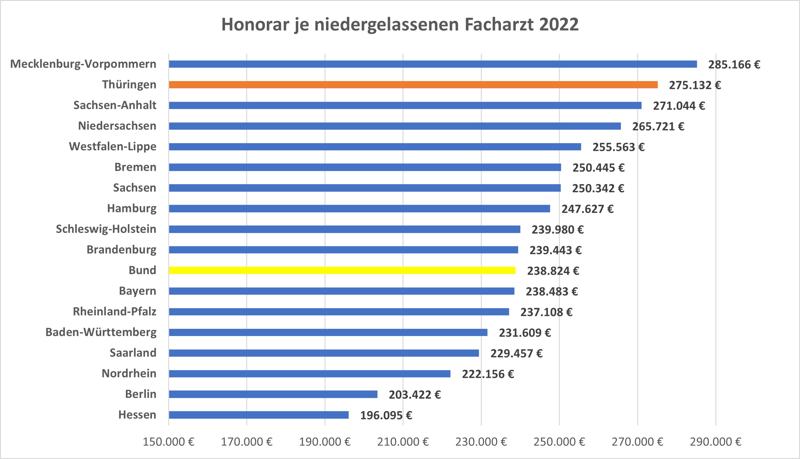Die niedergelassenen Thüringer Fachärzte erzielten im Jahr 2022 je Arzt einen Honorarumsatz von 275.132 Euro. Damit liegen die Fachärzte auf dem zweiten Platz im Bundesvergleich.