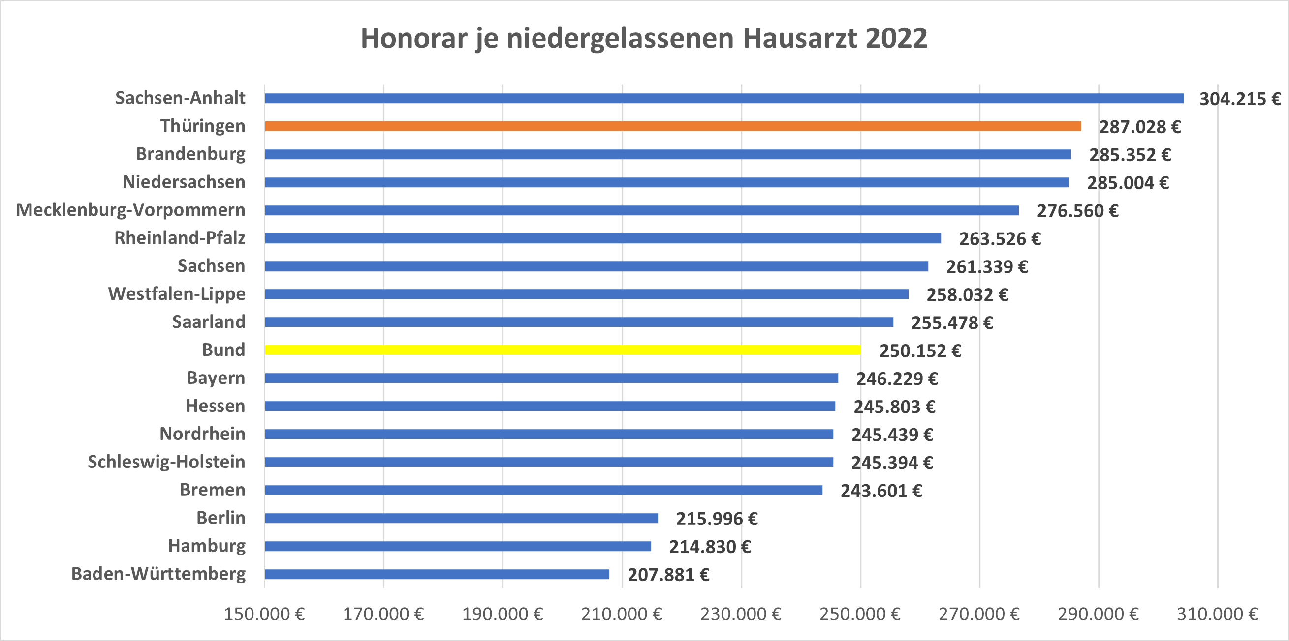 Die niedergelassenen Thüringer Hausärzte erzielten im Jahr 2022 je Arzt einen Honorarumsatz von 287.028 Euro. Damit liegen die Hausärzte auf dem zweiten Platz im Bundesvergleich.