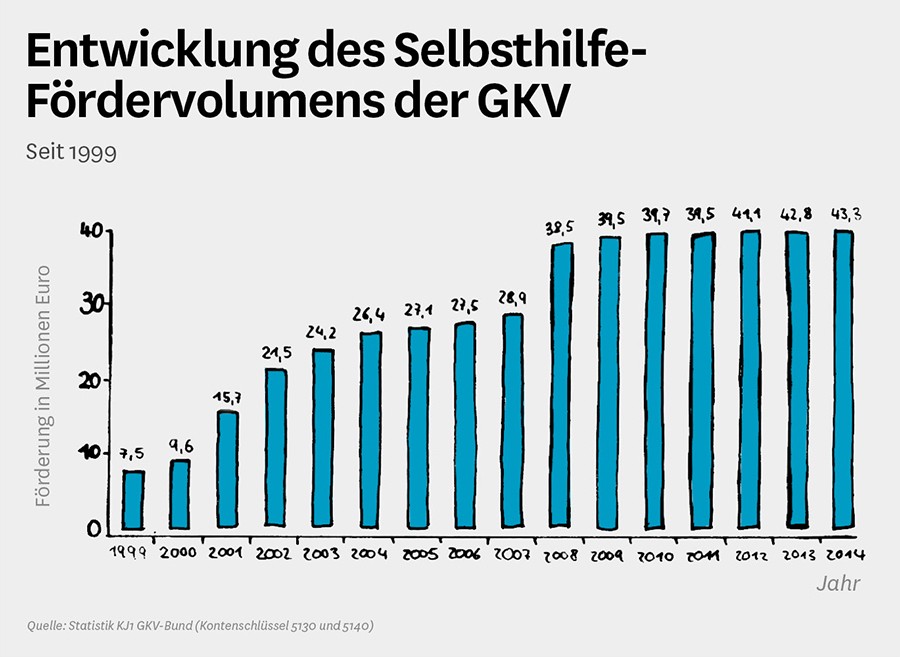 Bei knapp 70 Millionen Versicherten stellen die gesetzlichen Krankenkassen in diesem Jahr insgesamt 43,3 Millionen Euro an Selbsthilfemitteln zur Verfügung. Die Selbsthilfe kann somit jährlich auf die Krankenkassen als verlässlichen Förderer vertrauen. Weder andere Sozialversicherungsträger noch die öffentliche Hand fördern in diesem Umfang die Selbsthilfe.