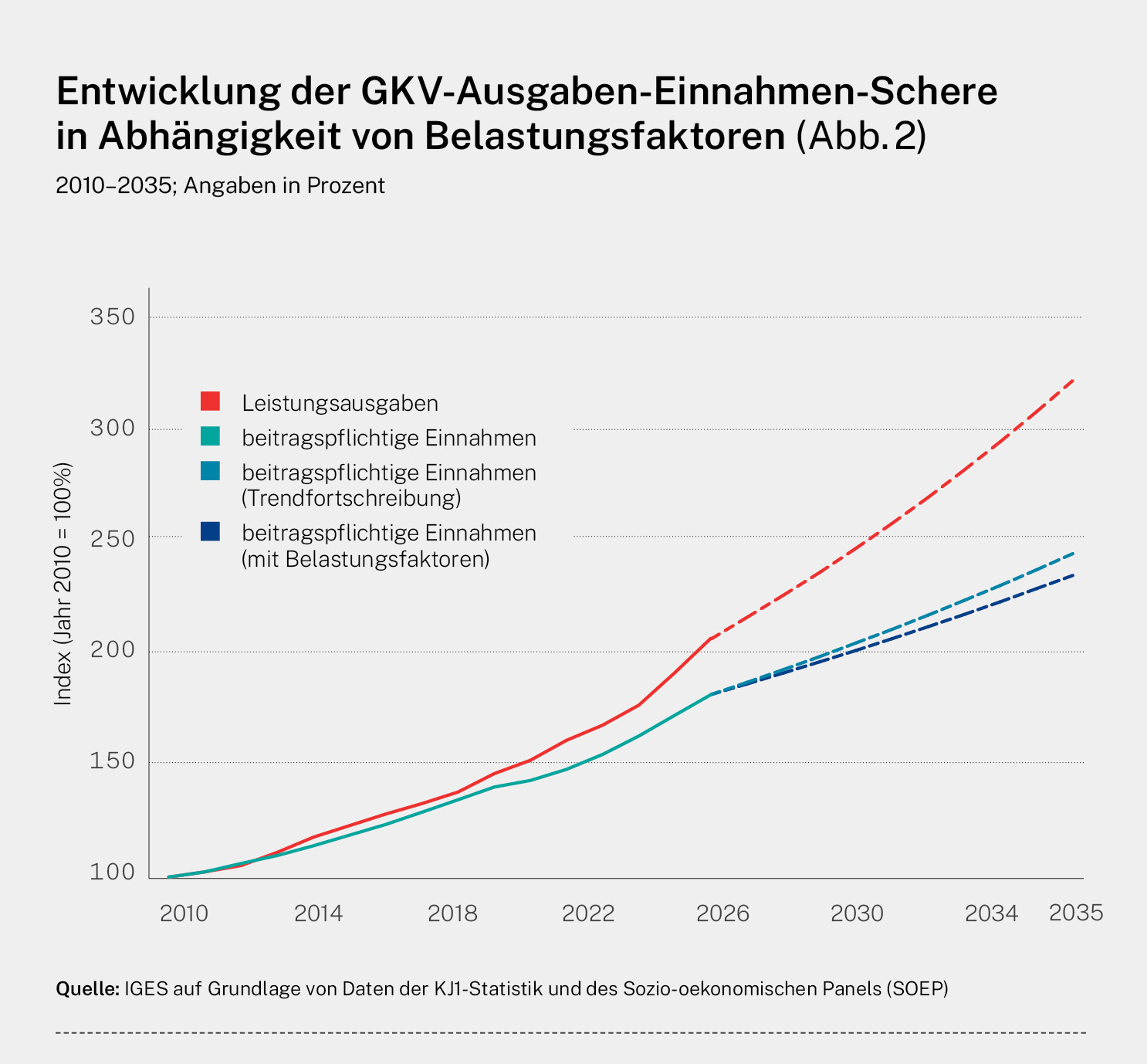 Demografisch bedingt wird die Zahl der Rentner in der GKV von knapp 17 Millionen im Jahr 2025 auf rund 20 Millionen im Jahr 2035 zunehmen. Da Rentner über deutlich geringere durchschnittliche beitragspflichtige Einnahmen verfügen, müsste dadurch der GKV-Beitragssatz um 0,2 Prozentpunkte angehoben werden. Würde die Teilzeitquote zukünftig noch halb so stark steigen wie in den letzten Jahren (von 35 Prozent im Jahr 2025 auf 40 Prozent im Jahr 2035), wäre ein zusätzlicher Beitragssatzanstieg im Umfang von 0,2 Punkten erforderlich. Insgesamt wird eine zusätzliche Belastung in Höhe von vier Beitragszehnteln entstehen, die dazu führt, dass sich die Ausgaben-Einnahmen-Schere der GKV zukünftig noch stärker öffnen wird als allein bei Trendfortschreibung der Ausgaben- und Einnahmen-Entwicklung (Abb. 2).