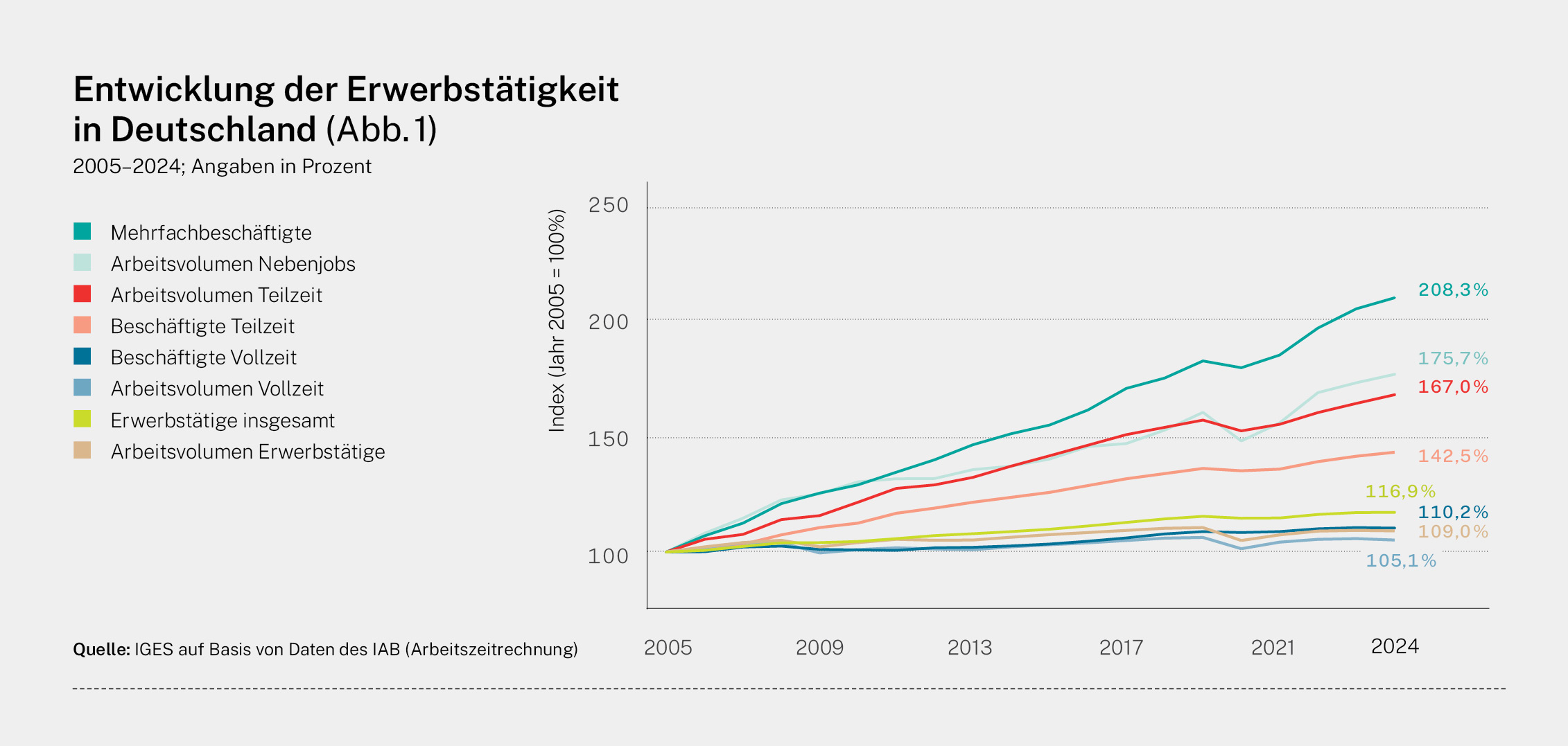 Die Ergebnisse zeigen, dass in den vergangenen 15 bis 20 Jahren (Stützzeitraum) strukturelle Verschiebungen bei der Erwerbstätigkeit – stark überproportionale Zunahme bei Nebenjobs und Teilzeitbeschäftigung bei nur noch geringfügiger Zunahme von Vollzeitbeschäftigung (Abb.1) – zu Veränderungen in der Mitgliederstruktur der GKV geführt haben.
