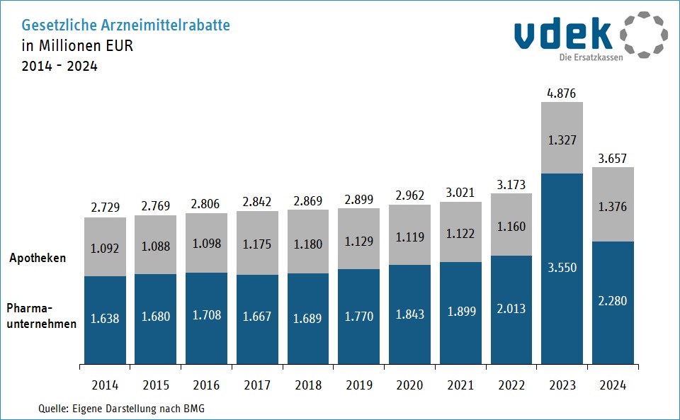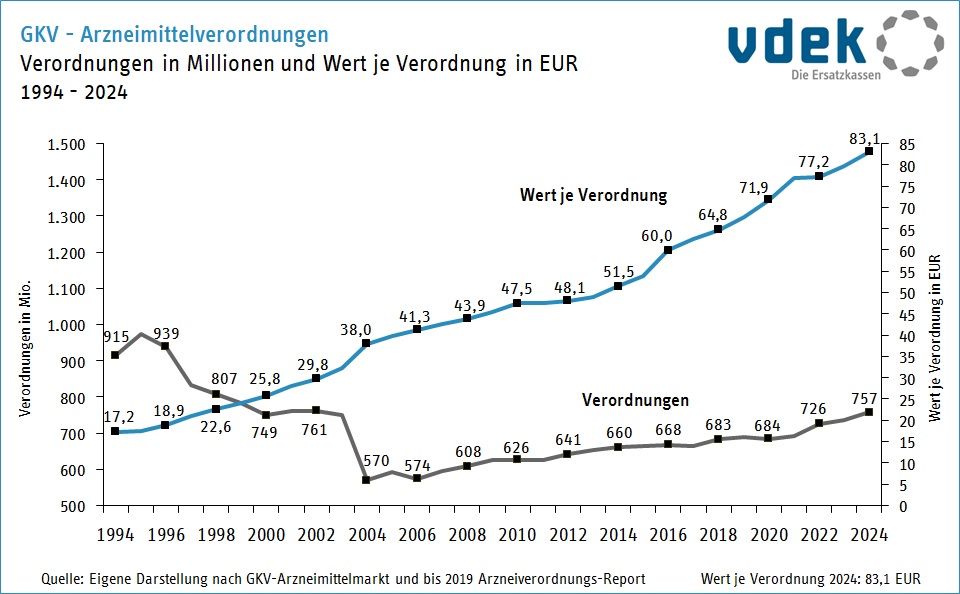 55,2 Mrd. EUR wurden 2024 in der gesetzlichen Krankenversicherung (GKV) für Arzneimittel ausgegeben, was einem Anteil von 16,8 Prozent an den Ausgaben insgesamt entspricht. Somit ist dieser Sektor der zweitgrößte nach den Ausgaben für den stationären Bereich (Krankenhaus), jedoch etwa als halb so groß wie dieser.