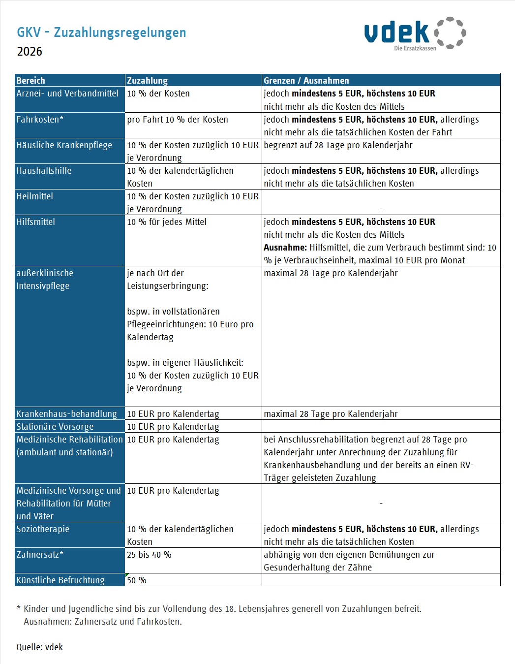 Die gesetzlichen Regelungen sehen für viele Leistungen (z. B. Arzneimittel, Krankenhausbehandlung, Krankengymnastik) Zuzahlungen in unterschiedlichen Höhen vom Versicherten vor. Um übermäßige Belastungen zu vermeiden, gibt es jährlich eine neu zu ermittelnde Zuzahlungsgrenze. Sobald diese erreicht ist, kann eine Befreiung von weiteren Zuzahlungen bei der Krankenkasse beantragt werden. Die Befreiung gilt dann für den Rest des Kalenderjahres. Ebenso besteht vielfach die Möglichkeit einer Zuzahlungsvorauszahlung, worauf von der Krankenkasse ein Befreiungsausweis ausgestellt wird.