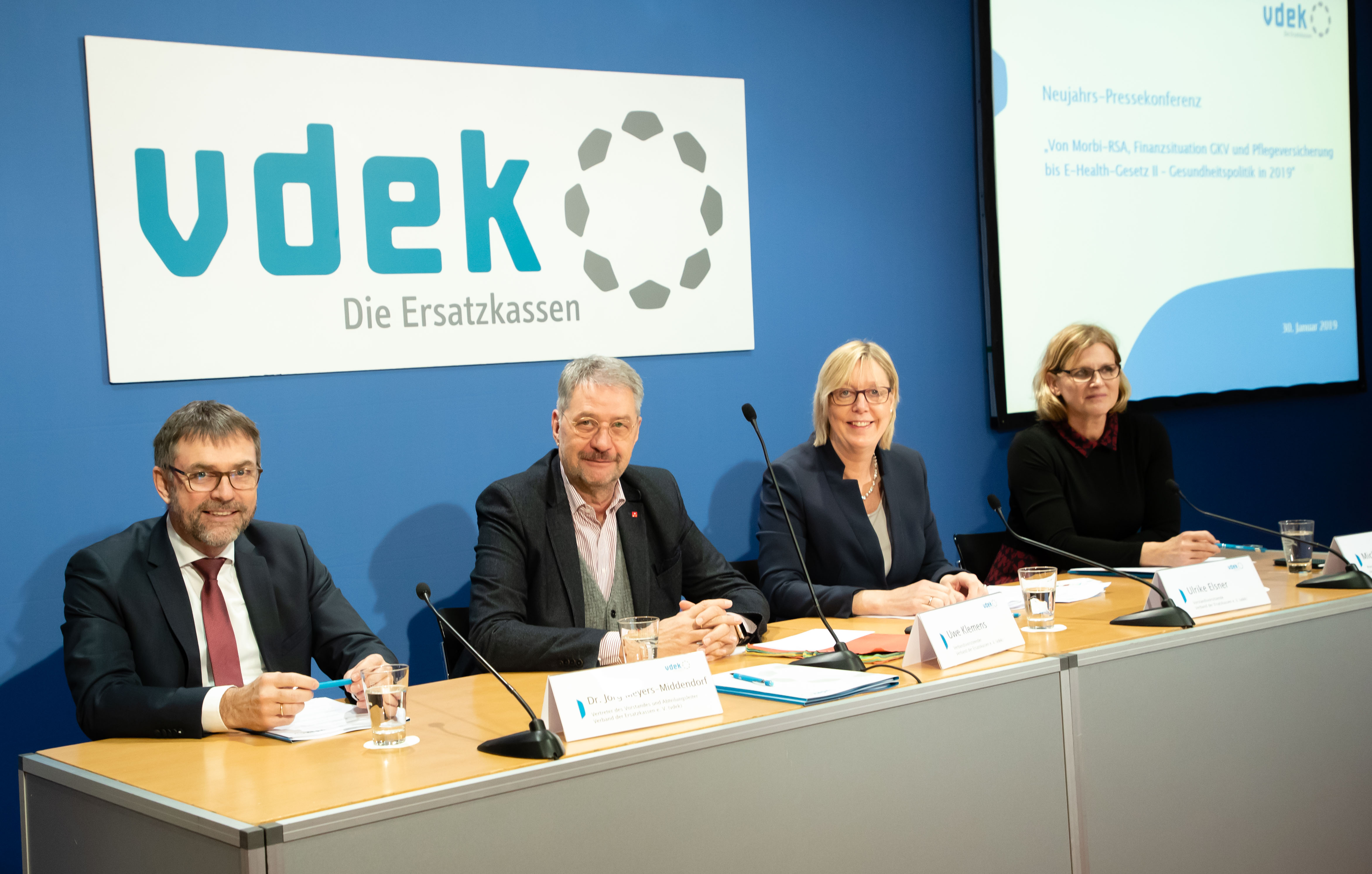vdek-Neujahrs-Pressekonferenz 2019, v.l.n.r.: Dr. Jörg Meyers-Middendorf (Vertreter der Vorstandsvorsitzenden und Abteilungsleiter Politik/Selbstverwaltung), Uwe Klemens (Verbandsvorsitzender), Ulrike Elsner (Vorstandsvorsitzende), Michaela Gottfried (Pressesprecherin und Leiterin Abteilung Kommunikation)