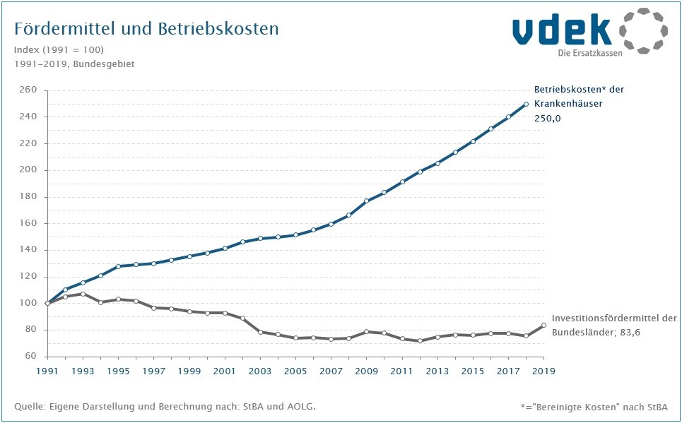 Die Investitionskosten von Krankenhäusern werden grundsätzlich von den Bundesländern finanziert. Doch die Länder sind ihrer Verpflichtung zur Investitionsfinanzierung in den letzten Jahren immer weniger nachkommen. So lagen die Investitionsmittel, die alle Bundesländer den Krankenhäusern im Jahr 2017 zur Verfügung gestellt haben, bei 2,98 Mrd. Euro. 1991 lag die Investitionsfinanzierung der Bundesländer noch bei 3,64 Mrd. Euro, d.h. es gab seitdem einen Abbau um 18 Prozent, während im gleichen Zeitraum die Krankenhausausgaben der Krankenkassen von 29 Mrd. Euro auf insgesamt 75 Mrd. Euro angestiegen sind. Damit ist der Anteil der Krankenhausfinanzierung der Länder seit 1991 von über 10 Prozent auf unter 4 Prozent gesunken. Vor dem Hintergrund der Unterfinanzierung steigt bei den Krankenhäusern der Anreiz zur Leistungsausweitung, um die Kosten decken zu können.
